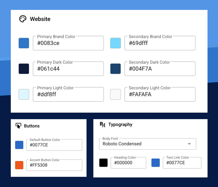 Easily customize your website’s appearance by selecting colors that reflect your brand identity. Our intuitive design setup module lets you define your brand’s primary and secondary colors, which are then applied consistently across your site—from buttons and backgrounds to typography and accent elements.